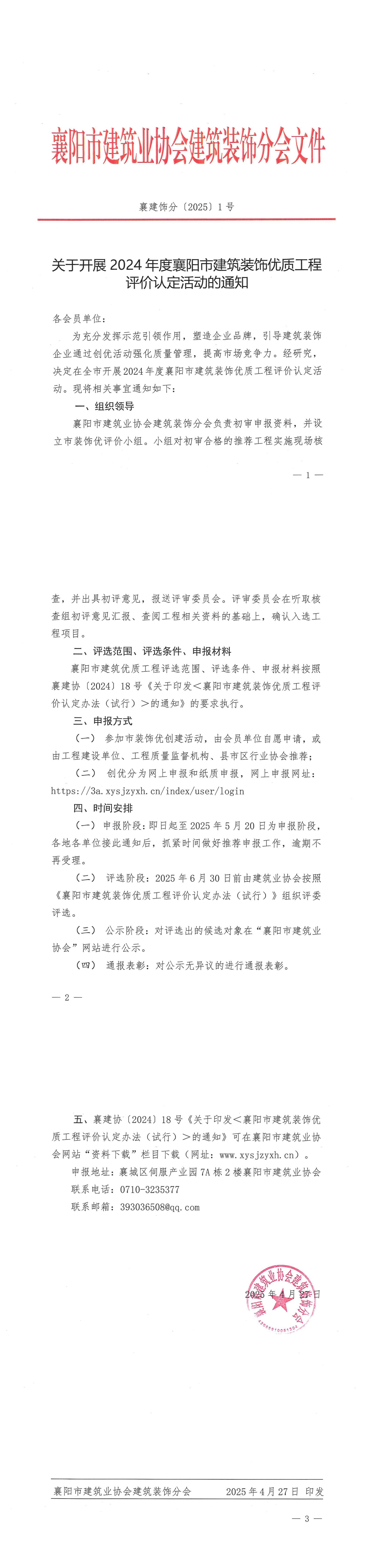 襄建飾分〔2025〕1號(hào) 關(guān)于開(kāi)展2024年度襄陽(yáng)市建筑裝飾優(yōu)質(zhì)工程評(píng)價(jià)認(rèn)定活動(dòng)的通知