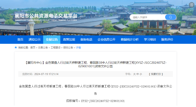 近日,襄陽市公共資源交易網(wǎng)發(fā)布金色營盤人行過街天橋新建工程、春園路38中人行過街天橋新建工程資審文件公告!
